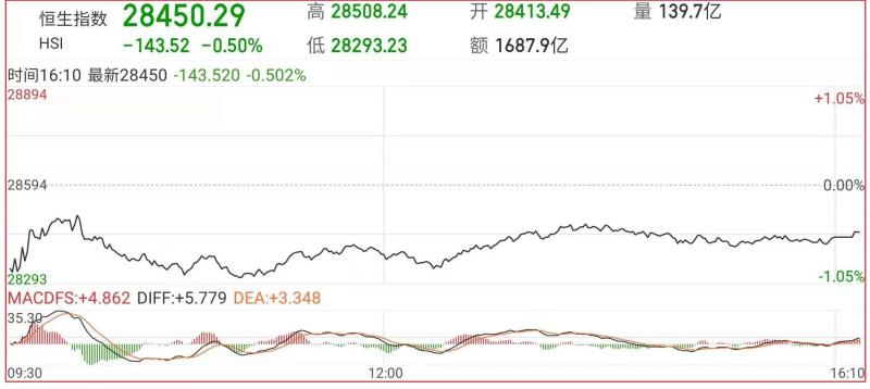 1.恒指昨早市先低开180点至28413点,其后进入整固之中,上落于28293点至28508点之间。大市虽略见反覆,但情况尚不算太差。截至港股收盘,恒生指数(28450.291 -143.52 -0.50%)跌0.5%,报28450.29点,国企指数跌0.11%,红筹指数跌1.46%;