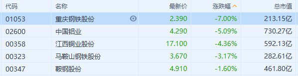 重庆钢铁股份跌7%,中国铝业跌超5%,江西铜业股份跌超4%,马鞍山钢铁股份跌超3%。国内商品期市开盘多数走低,黑色系期货领跌,铁矿主力合约跌超5%。国家发展改革委、工业和信息化部、国资委、市场监管总局、证监会等五个部门召开会议,联合约谈了铁矿石、钢材、铜、铝等行业具有较强市场影响力的重点企业,钢铁工业协会、有色金属协会参加。下一步,有关监管部门将密切跟踪监测大宗商品价格走势,加强大宗商品期货和现货市场联动监管,对违法行为“零容忍”,持续加大执法检查力度,排查异常交易和恶意炒作,坚决依法严厉查处达成实施垄断协议、散播虚假信息、哄抬价格、囤积居奇等违法行为。