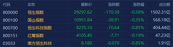 港股主要指数全线下跌,恒指尾盘跌幅扩大,收跌0.58%报29297点,国指跌0.35%报10951点,恒生科技指数跌0.85%报8235点。盘面上,前期弱势的猪肉概念股逆势拉升,中粮家佳康、万洲国际均涨超4%;石油股、汽车股、在线教育股在弱市中表现强势,中石油劲升逾3%创2020年2月以来新高价;光伏股跌幅靠前,物管股、手游股、黄金股大跌,恒大物业跌逾12%;此前强势的生物科技股全线回调,三胎概念股普跌;大型科技股网易跌超3%,阿里巴巴跌1.74%,腾讯、小米微幅收涨。今日大市成交额为1502亿港元,南下资金逆势净流入22.02亿港元。