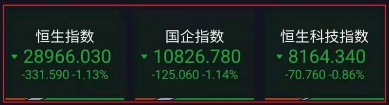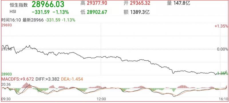 1.恒指昨早市先高开68点至29365点,其后一直处拉锯之中,上落于29223点至29377点之间,上午仍持续徘徊于上述波幅之内。午后恒指再度失守29000点,截至收盘,恒指跌1.13%,报28966.03点,国企指数跌1.14%,红筹指数跌0.54%;
