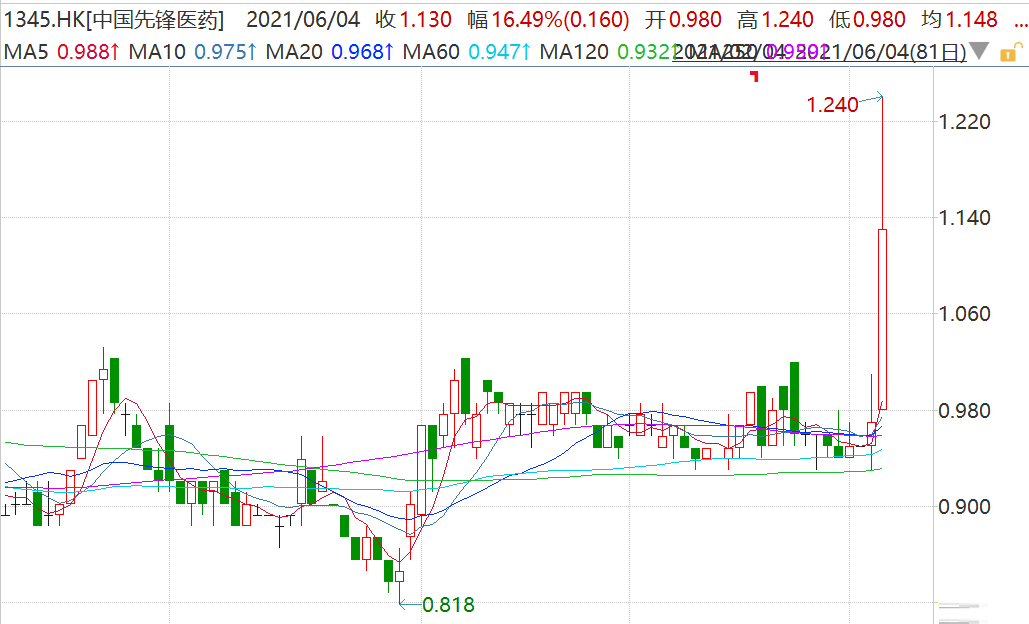 中国先锋医药(1345.HK)今日大涨,盘中最高涨27.84%报1.24港元,股价创去年5月以来新高,目前涨幅20%左右,市值15亿港元。