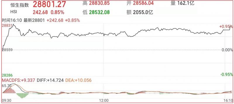1.上周五恒指早市先轻微高开28点至28586点,其后曾略作整固而轻回至28532点。惟在买盘再度维稳下,大市卒再缓步推上,随后涨幅扩大。截至收盘,恒生指数涨0.85%,报28801.27点;国企指数涨0.54%,红筹指数跌1.45%;
