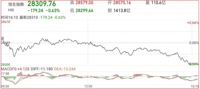 1.恒指昨早市先稍高开86点至28575点,其后一直处整固之中,徘徊于28363点至28579点之间,上午技术上仍拉锯于上述波幅之内。午后恒指小幅跳水,截至收盘,恒指涨0.63点,报28309.76点,国企指数跌0.74%,红筹指数跌0.1%;