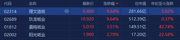 港股纸业股逆势拉升上扬,理文造纸、玖龙纸业均大涨9.5%,晨鸣纸业涨3.5%,阳光纸业涨近3%。近期,废纸资源出现供不应求的局面,废纸回收价比去年同期增长了约20%。业内人士介绍,在箱板瓦楞纸的原材料当中,废纸的比例一般都占到85%以上。目前,市场上不少箱板瓦楞纸的经销商库存积压,抑制了纸价上涨。分析人士判断,下半年需求旺季来临,废纸回收价或许将迎来新一轮的上涨空间。华创证券认为,强者愈强,造纸龙头投资黄金期到来。2021年全年维度看废纸紧缺确定性较高,国废价格和成品纸价格均有望迎来上涨。