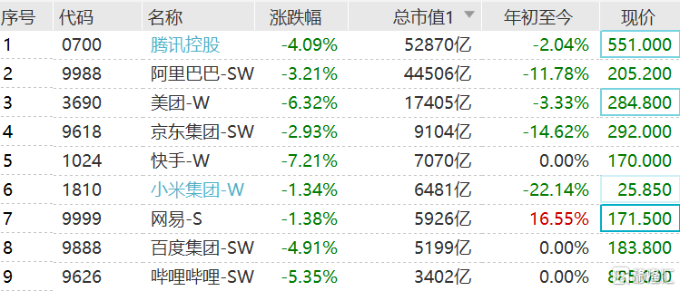 受网络安全审查事件影响,港股大型科网股集体下跌,午后跌幅进一步扩大,恒生科技指数一度跌2.87%。成分股中,美团和快手盘中均大跌超7%,哔哩哔哩和百度跌超5%,腾讯跌超4%,阿里巴巴、京东集团跌超3%。