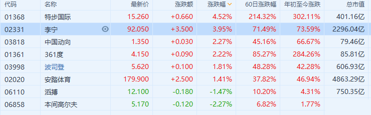 体育用品股走强,特步(1368.HK)涨超4%创历史新高,市值超400亿港元,年内已累涨超3倍;李宁涨近4%,361度、中国动向涨超2%,安踏涨超1%。特步此前获高瓴认购5亿港元可换股债券。瑞信发研报指,过往特步估值较低主要由于其增长较低,加上与市场沟通不足,而其规模亦较小,不过近期获高瓴投资后可去除投资者对公司配股的忧虑,而高瓴的往绩亦为公司增加信誉。该行将公司评级由“中性”升至“跑赢大市”,目标价大升238%至13.2港元。摩通亦指,安踏为中国最大的本土体育服饰公司,去年的市场占有率为15%,升目标价至190港元,评级“增持”;该行亦予李宁“增持”评级,目标价升至92港元,料公司增长将受惠销售势头及利润扩张。