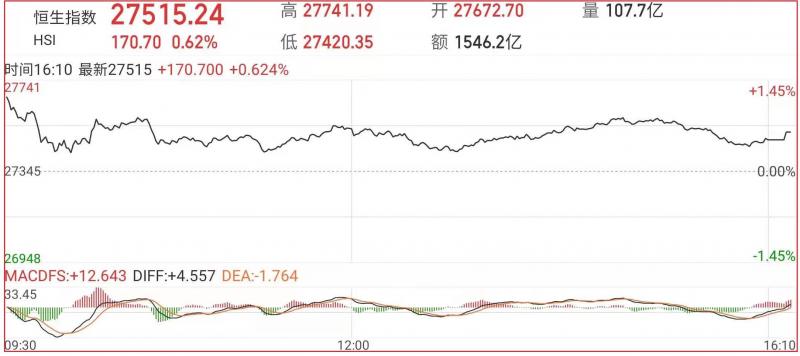 1.恒指昨早市先高开328点至27672点,其后曾进一步升至27741点,但由于买盘态度保守,故大市不但未能再进一步推进,其后更开始渐趋反覆,大市在零碎沽压主导下已一度低见27420点,午后窄幅震荡。截至收盘,恒指涨0.62%,国企指数涨0.61%,红筹指数涨0.49%;