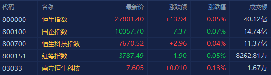 港股主要指数开盘涨跌不一,恒指涨0.05%报27801点,国指跌0.07%报10057点,恒生科技指数涨0.04%报7670点。