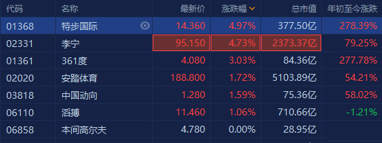 特步、李宁均涨近5%,且李宁有望挑战高位,361度涨超2%,安踏涨1.7%再创历史新高。近日体育用品股持续获券商唱好,中金研报称,特步国际零售流水增长超预期,预计下半年及2022年收入增长提速,上调目标价126%至15.86港元;国金证券称安踏体育作为全面覆盖黄金赛道的多品牌体育服饰集团,有望在享受国内外体育服饰行业增长β机会的同时以优秀的管理能力、领先的渠道效率、多品牌运营能力等α属性提升整体市场份额。另外,361度公布第二季度主品牌零售额同比录得15至20%的增长。