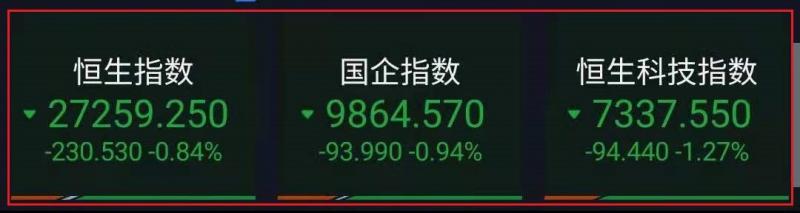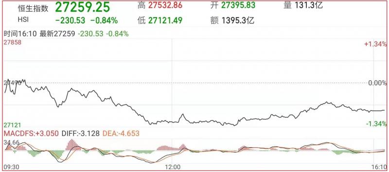 1.恒指昨早市先低开94点至27395点,其后曾略后抽43点至27532点。但由于买盘却步,加上沽压又再阵阵涌现,故整个大市卒再掉头回落,临近午盘再度跌超1%。午后恒指地府收窄,截至收盘,恒指跌0.84%,报27259.25点,国企指数跌0.94%,红筹指数跌0.64%;
