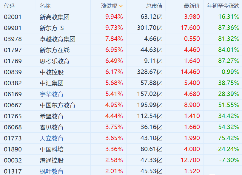 新华社深夜发声“维稳”,隔夜中概股上演暴力反弹,带动今早港股市场集体高开。此前持续大跌的教育股集体反弹,新高教、新东方涨近10%,卓越教育集团涨近8%,新东方在线、思考乐教育、中教控股涨超6%,中汇集团、宇华教育涨超5%。