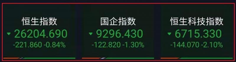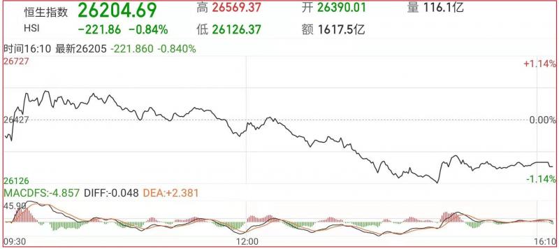 1.恒指早市先轻微低开316点至26390点,其后一直处拉锯之,中上落于26310点至26569点之间,恒指走势反复,午后恒指不断下挫,截至收盘,恒生指数跌0.84%,报26204.69点,国企指数跌1.3%,报9296.43点,红筹指数跌0.19%,报3698.99点;