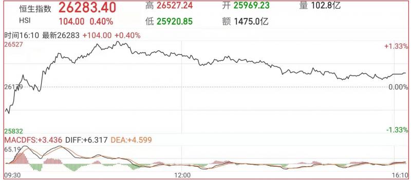 1.恒指昨早市先低开210点至25969点,其后再稍跌至25920点方渐见喘定并回升。在腾讯(700)及美团点评(3690)反弹带动下,市势缓步回升,午盘后涨幅收窄。截至收盘,恒指涨0.40%,报26283.40点,国企指数涨0.44%,红筹指数跌0.48%;