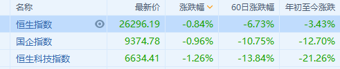 港股三大指数低开,恒指跌0.84%报26296点,国指跌0.96%报9374点,恒生科技指数跌1.26%报6634点。