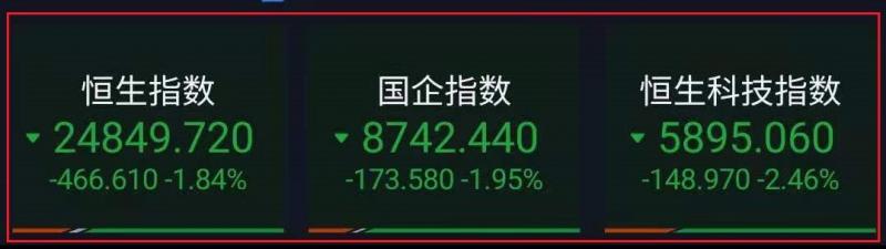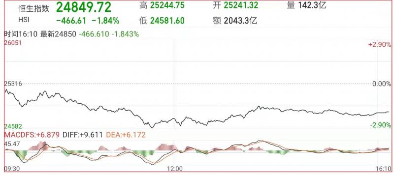 1.上周五恒指早市先低开75点至25241点,其后稍作整固后便由25244点开始急步回落,午前加速跌超700点,午后跌幅稍有收窄。截至收盘,国企指数跌1.95%,报8742.44点,红筹指数跌1.43%,报3753.92点;