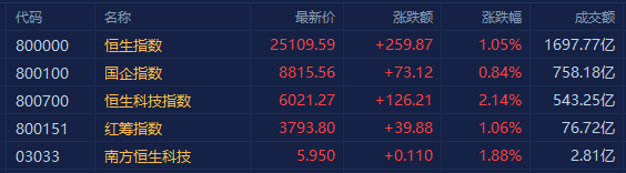 此前连续下跌的港股市场今日集体反弹,早盘三大指数均大涨超2.5%,恒生科技指数更是一度暴涨4.5%。午后指数涨幅集体收窄,恒指涨1.05%报25109点,国指涨0.84%报8815点,恒生科技指数涨2.14%报6021点。