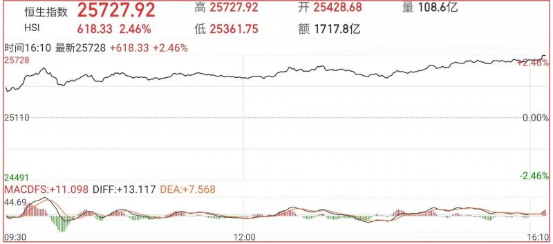1.恒指昨早市先高开319点至25428点,其后渐呈拉锯,上落于25361点至25603点之间,港股高开高走。截至收盘,恒生指数涨2.46%,报25727.92点,全日成交额达1717.83亿。国企指数涨3.21%,报9098.68点,红筹指数涨0.45%,报3810.85点;