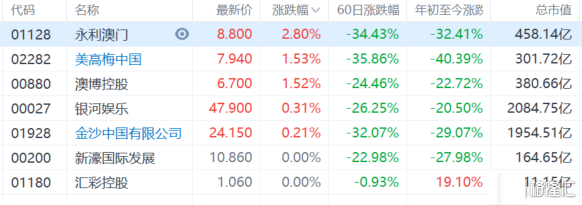 昨日全线大涨的濠赌股今日继续走强,永利澳门(1128.HK)涨近3%,美高梅中国、澳博控股涨超1%。