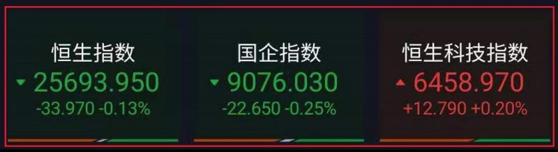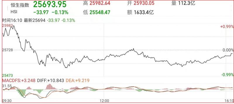 1.恒指昨早市先高开203点至25930点,其后再进一步升至25982点方渐受规限,盘中转跌,午后恒指窄幅震荡。截至收盘,恒生指数跌0.13%,报25693.95点,全日成交额达1633.4亿。国企指数跌0.25%,报9076.03点,红筹指数跌0.05%,报3809.05点;