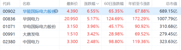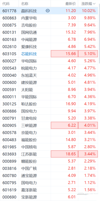 港A两市电力股继续走强,港股中,华能国际电力(0902.HK)涨超6%,华润电力涨超5%;A股中,晶科科技涨停,吉电股份涨超9%,芯能科技、华电国际涨超5%,太阳能、国投电力等纷纷上涨。