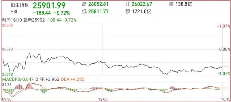 1.上周五恒指早市先轻微低开68点至26022点,其后在零碎沽盘力压下再进一步回落279点至25811点。由于低位沽压渐消,加上维稳买盘再现,故市势亦伺机反弹至26052点,总体港股低开低走,截至收盘,恒生指数跌0.72%,报25901.99点,国企指数跌0.53%,红筹指数涨0.61%;