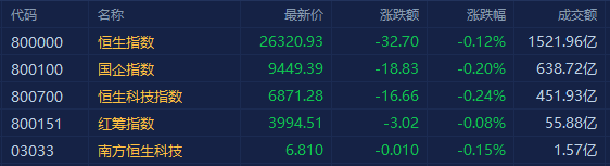 港股三大指数集体收跌,恒指跌0.12%报26320点,国指跌0.2%报9449点,恒生科技指数跌0.24%报6871点。