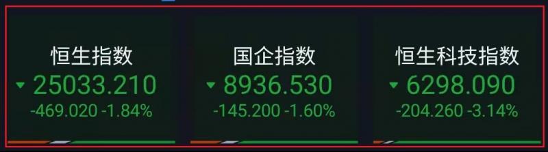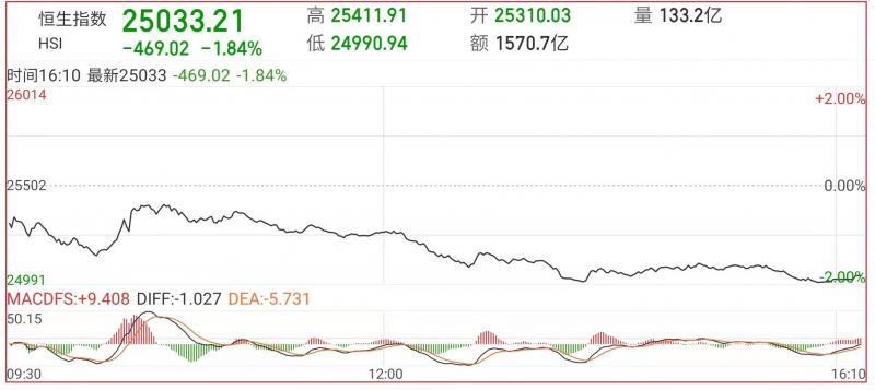 1.恒指昨早市先低开192点至25310点,其后再进一步跌至25131点方渐见喘定,其时大市已再急回371点。由于维稳买盘渐现,故市势得以略作回升,而恒指亦顺势后抽至25411点。只是在买盘虚怯下,大市未能作进一步推升。截至收盘,恒指跌1.84%,报25033.21点,国企指数跌1.6%,红筹指数跌0.82%;