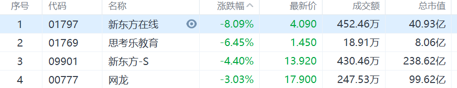 在线教育股普跌,新东方在线跌逾8%,思考乐教育跌6.45%。