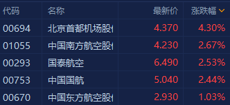 受隔夜美股航空股上涨带动,港股航空股全线反弹,北京首都机场涨4.3%,南方航空、中国国航、国泰航空皆涨超2%。