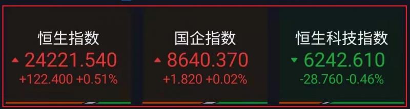 1.周二港股指数午后震荡回暖,地产、**、环保、电力、物管板块领涨,科技股走弱,汽车、餐饮、银行、医药、烟草等板块表现低迷。港股低开高走,截至收盘,恒生指数涨0.51%,报24221.54点,国企指数涨0.02%,红筹指数涨1.23%;