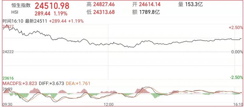 1.恒指昨早市先高开393点至24614点,其后再进一步升至24827点方渐受规限,即其时大市已反弹606点,但由于高台买盘再见保守,加上伺高回吐的零碎沽压渐增,故整个大市开始渐转反复,升幅亦续步收窄,截至收盘,恒生指数(24510.979 289.44 1.20%)涨1.19%,报24510.98点,国企指数涨1.08%,红筹指数涨2.33%;