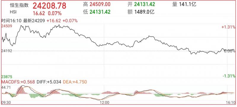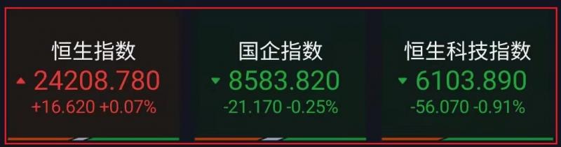 1.恒指昨早市先升开61点至24131点,其后在维稳买盘支持下逐步回升,随后翻红一度涨超1%,尾盘再次走软。截至收盘,恒生指数涨0.07%,报24208.78点;国企指数跌0.25%,红筹指数跌0.21%;