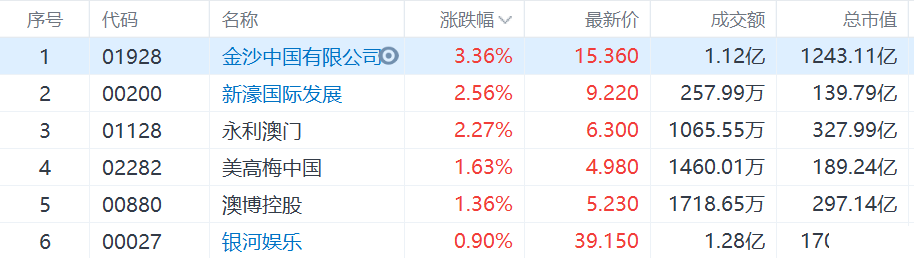 **股普涨,金沙中国涨3.36%,新濠国际发展涨2.56%,永利澳门涨2.27%。