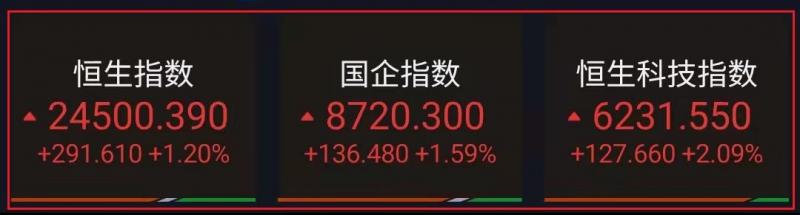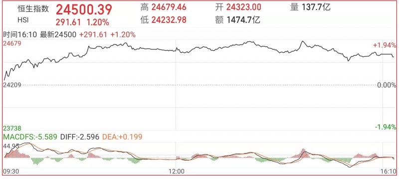 1.恒指昨早先高开115点至24323点,其后在维稳买盘支持下再缓步上升。一度上升446点至24654点,截至收盘,恒生指数(24529.74 320.96 1.33%)涨1.2%,报24500.39点;国企指数涨1.59%,红筹指数涨2.02%;