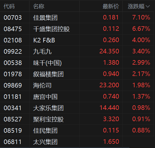 港股餐饮股普遍上涨,九毛九涨3.4%、味千中国涨3%,叙福楼、大家乐等多数上涨,海底捞小幅走低。