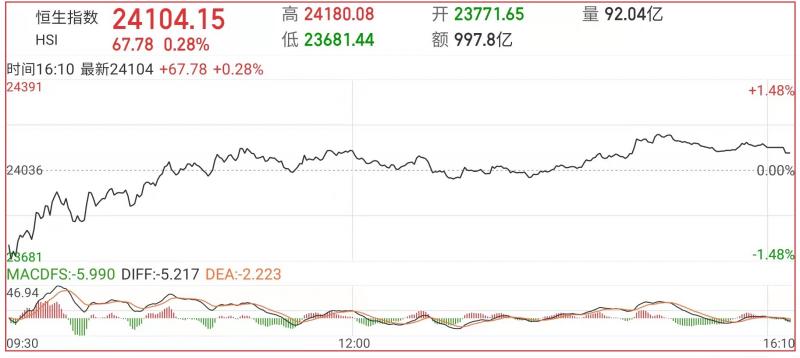 1.港股昨早先低开265点至23771点(此乃9月21日之低位)。其后在零碎沽压主导下再进一步跌至23681点方渐见喘定并作技术性后抽。今日港股低开高走,截至收盘,恒生指数(24104.15 67.78 0.28%)涨0.28%,报24104.15点,国企指数跌0.07%,红筹指数涨0.29%;