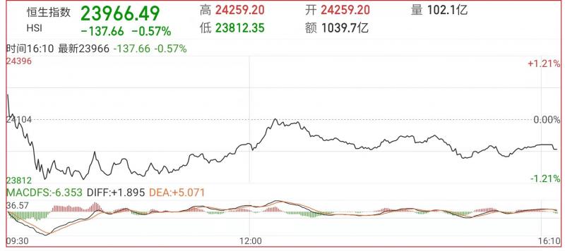 1.恒指昨早市先高开155点至24259点,但由于买盘不继,加上零碎沽压再现,故整个大市卒再现反复,而恒指亦再度跌穿24000点,恒指随外围跌幅再度扩大,截至收盘,恒指跌0.57%,报23966.49点,国企指数跌1.21%,红筹指数跌0.35%;