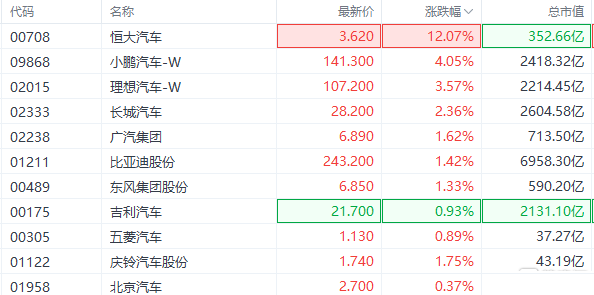 港股汽车股集体走高,恒大汽车(0708.HK)拉升涨超12%,小鹏汽车(9868.HK)涨超4%,理想汽车(2015.HK)涨超3%,长城汽车(2333.HK)、广汽集团(2238.HK)、比亚迪股份(1211.HK)等跟涨。