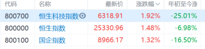 港股三大指数集体收涨,恒指涨1.48%报25330点,国指涨1.32%报8966点,恒生科技指数涨1.92%报6318点。