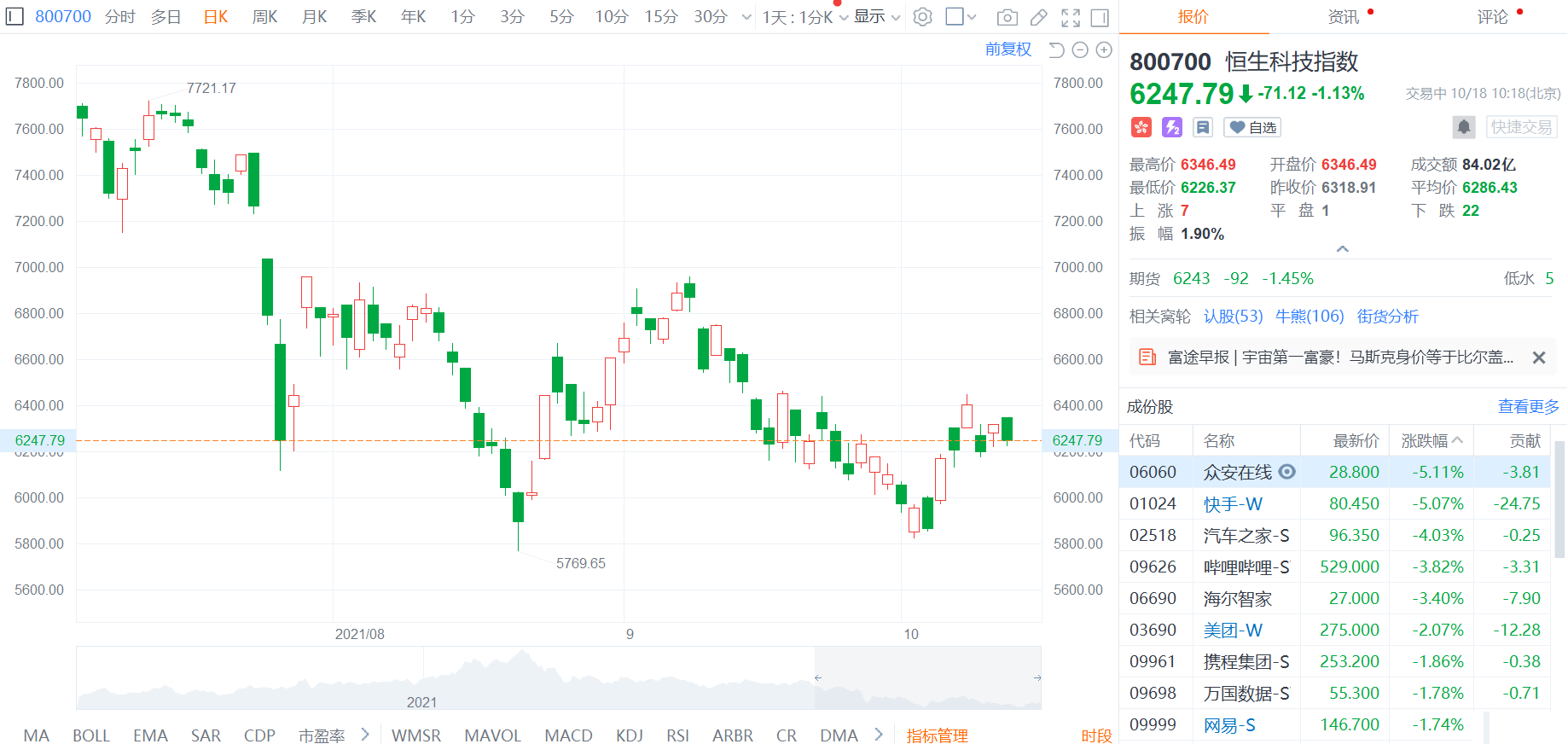 恒生科技指数跌逾1%,报6247.79点。成分股方面,众安在线和快手均跌逾5%,汽车之家和哔哩哔哩跌约4%,美团跌逾2%。工信部部长肖亚庆昨日表示,下一步将继续深入推进互联网行业专项整治行动,压实企业主体责任,加强监督检查,完善协调机制,抓住难点问题,进一步加大工作力度,努力营造公平竞争、安全有序的互联网市场环境。