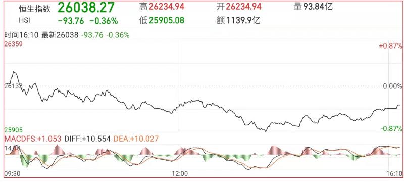 1.恒指昨早市先高开102点至26234点,即技术上再轻创月内之新高,但由于买盘态度略带保守,故大市未能伺机作进一步推升,其后在零碎回吐沽压涌现下,技术上又再重陷反复,截至收盘,恒生指数跌0.36%,报26038.27点;国企指数跌0.67%,红筹指数跌1.08%;