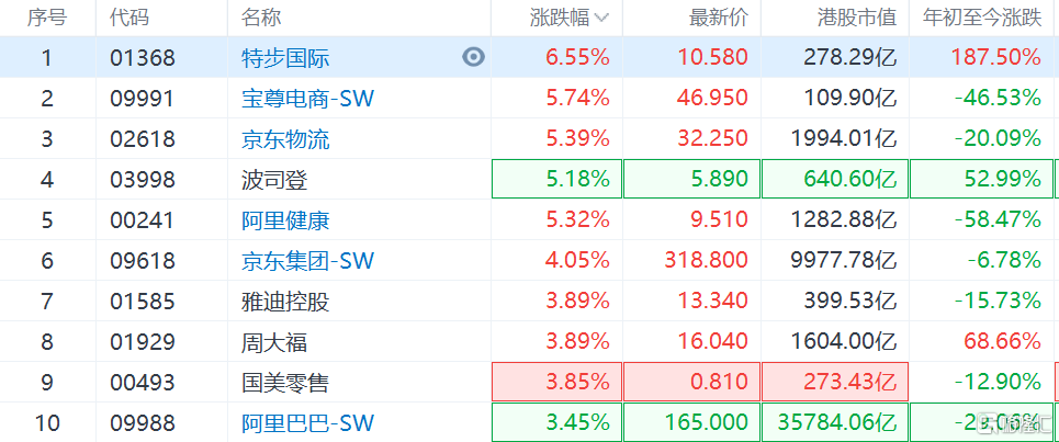 双十一概念股集体上涨,其中特步国际涨6%,宝尊电商,京东物流,波司登,阿里健康涨5%,京东集团涨4%,周大福,阿里巴巴涨3%。