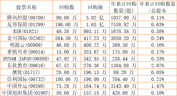 晨讯科技(02000)、资本策略地产(00497)、信利国际(00732)、澳优(01717)、伟仕佳杰(00856)、艾德韦宣集团(09919)、DYNAM JAPAN(06889)、中国外运(00598)、希慎兴业(00014)、亿胜生物科技(01061)、旭辉永升服务(01995)、亿都(国际控股)(00259)、腾讯控股(00700)、创新奇智(02121)、祖龙娱乐(09990)、金川国际(02362)、明源云(00909)、德祥地产(00199)、天福(06868)、汇量科技(01860)、中国旭阳集团(01907)、嘉里建设(00683)、中原建业(09982)、科通芯城(00400)、东软教育(09616)、和谐汽车(03836)、友邦保险(01299)、赛生药业(06600)、圣诺医药-B(02257)、ESR(01821)于2022年7月14日进行了回购。其中,回购金额最大的为腾讯控股(00700),回购数量90.00 万,回购金额3.02 亿元。