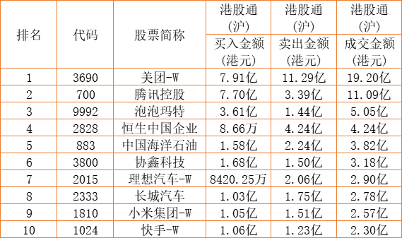 港股通(沪)买卖前十股(单位:港元):
