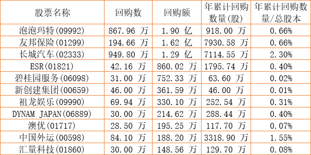 亿胜生物科技(01061)、美瑞健康国际(02327)、百奥家庭互动(02100)、泡泡玛特(09992)、DYNAM JAPAN(06889)、澳优(01717)、长城汽车(02333)、中国外运(00598)、祖龙娱乐(09990)、德祥地产(00199)、赛生药业(06600)、亿都(国际控股)(00259)、碧桂园服务(06098)、友邦保险(01299)、新创建集团(00659)、汇量科技(01860)、艾德韦宣集团(09919)、乐声电子(00213)、民银资本(01141)、东软教育(09616)、圣诺医药-B(02257)、中国旭阳集团(01907)、创梦天地(01119)、和谐汽车(03836)、ESR(01821)于2022年7月18日进行了回购。其中,回购金额最大的为泡泡玛特(09992),回购数量867.96 万,回购金额1.90 亿元。
