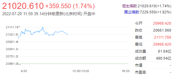 截至午间收盘,恒生指数(21021.68 360.62 1.75%)涨1.74%,报21020.61点;国企指数涨1.82%,红筹指数涨0.52%。恒生科技指数(4610.68 103.94 2.31%)涨2.29%,哔哩哔哩涨8.66%,阿里涨4.26%,百度涨4.45%。