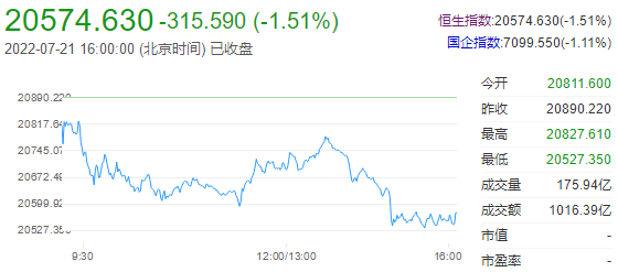 大盘放量调整,恒指失守5日均线,恒科指逆市飘红。早盘,股指低开后震荡回撤。午盘,指数前半段以反弹为主,恒科指一度涨1.3%。不过,尾盘时段,股指重拾跌势,并触及日低。截至收盘,恒生指数跌1.51%或315.59点,报20574.63点,全日成交额1016.39亿港元;国企指数跌1.11%,报7099.55点;恒生科技指数涨0.12%,报4582.36点。