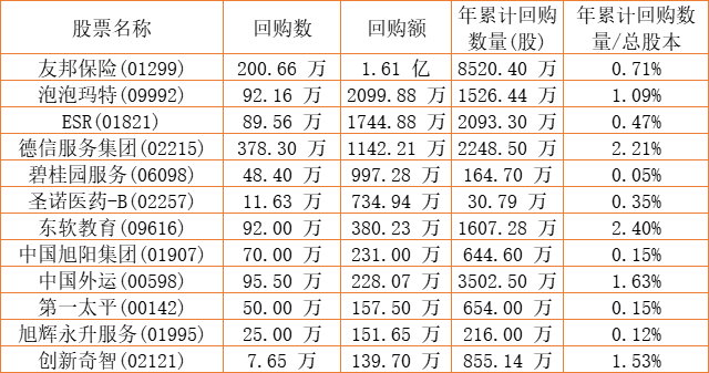 亿胜生物科技(01061)、旭辉永升服务(01995)、第一太平(00142)、艾德韦宣集团(09919)、泡泡玛特(09992)、亿都(国际控股)(00259)、中国外运(00598)、创新奇智(02121)、瑞安建业(00983)、德祥地产(00199)、民银资本(01141)、乐声电子(00213)、友邦保险(01299)、汇量科技(01860)、百奥家庭互动(02100)、碧桂园服务(06098)、ESR(01821)、和谐汽车(03836)、东软教育(09616)、圣诺医药-B(02257)、中国旭阳集团(01907)、德信服务集团(02215)于2022年7月21日进行了回购。其中,回购金额最大的为友邦保险(01299),回购数量200.66 万,回购金额1.61 亿元。