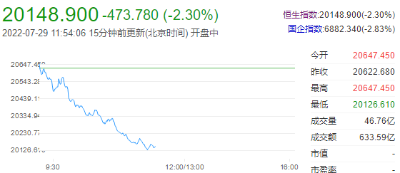 今日早盘,港股恒指高开低走,午盘大跌2.3%%,报20148.9点。恒生科技指数(4361.42 -191.12 -4.20%)大跌4.25%,京东健康(59.5 -5.85 -8.95%)跌超9%,快手跌超8%,哔哩哔哩、阿里健康(4.65 -0.37 -7.37%)跌7%,阿里巴巴跌5.8%,美团跌5.2%。