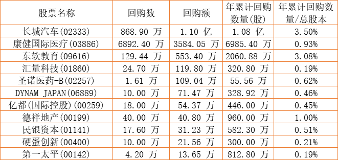艾德韦宣集团(09919)、DYNAM JAPAN(06889)、德祥地产(00199)、长城汽车(02333)、亿都(国际控股)(00259)、第一太平(00142)、汇量科技(01860)、瑞安建业(00983)、民银资本(01141)、东软教育(09616)、康健国际医疗(03886)、圣诺医药-B(02257)、硬蛋创新(00400)于2022年7月28日进行了回购。其中,回购金额最大的为长城汽车(02333),回购数量868.90 万,回购金额1.10 亿元。